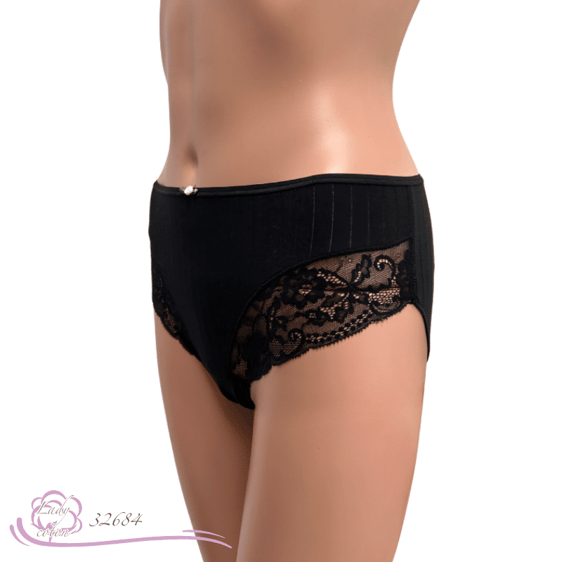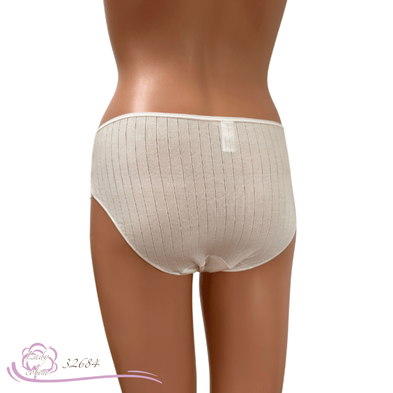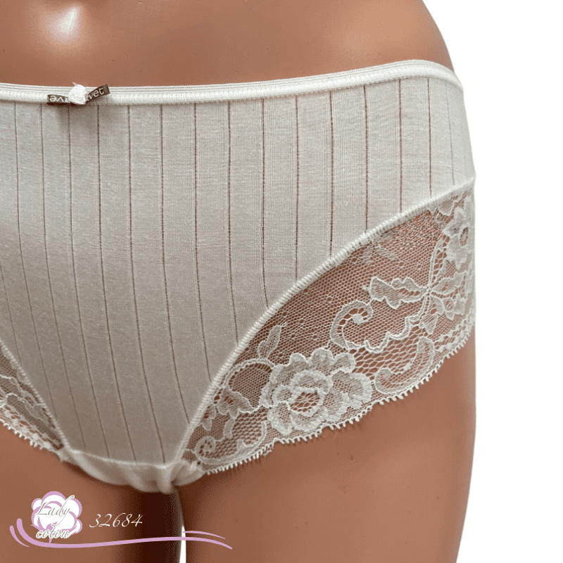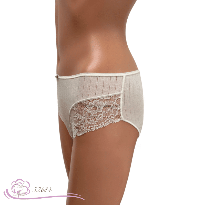 Cette culotte en matière naturelle se présente avec un tissu légèrement ajouré à l’horizontale. Puis une jolie dentelle de Calais surmonte chaque cuisse. On retrouve aussi la petite rose que AVET aime agrémenter quelques uns de ses modèles. D’un autre côté, un coton éponge vient doublé son fond (gousset). La hauteur de hanche s’apparente à une taille midi par contre l’arrière reste couvrant.