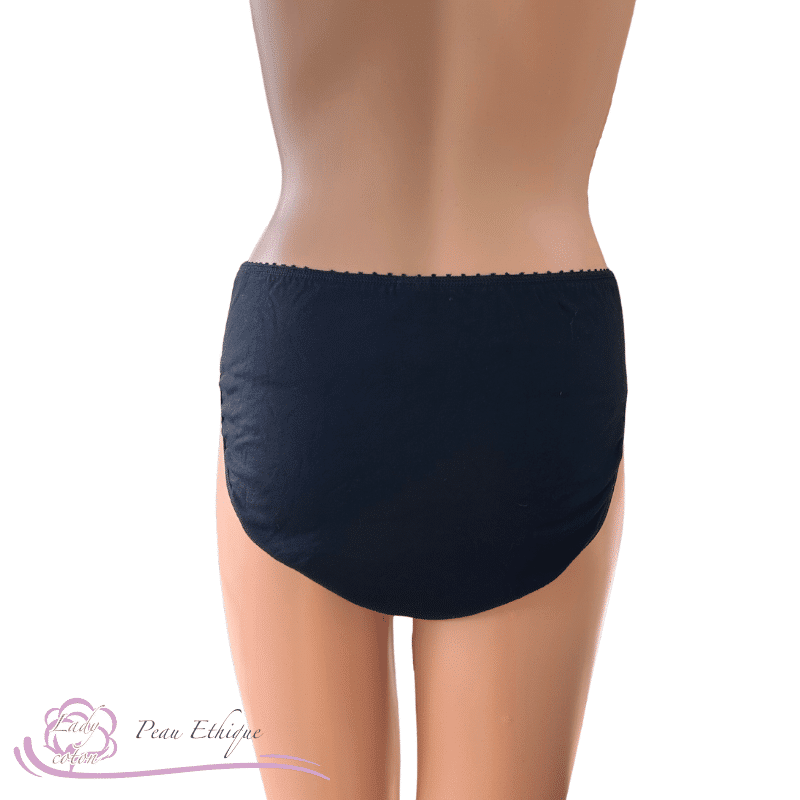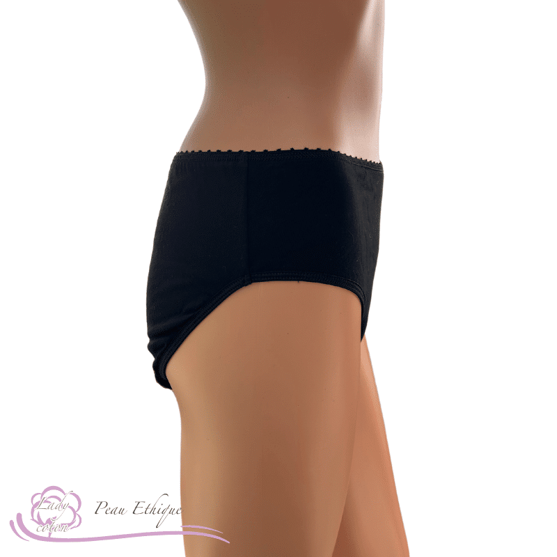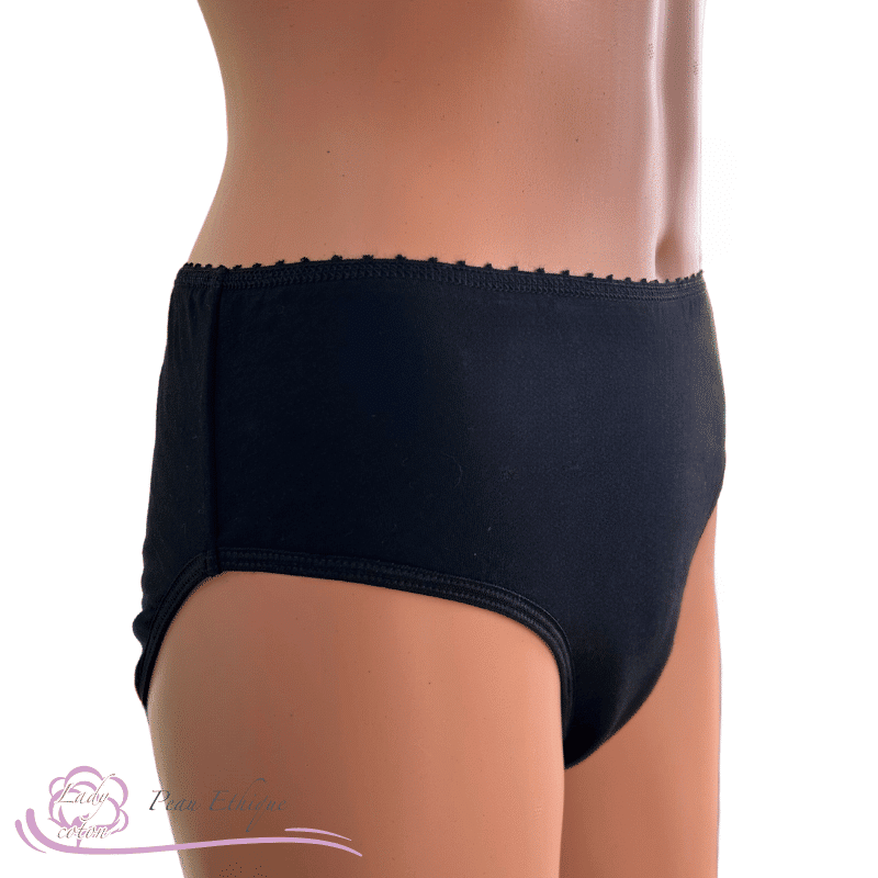 Surmontée d’un élastique fantaisie en picots, pour le côté féminin et fait de COTON BIO pour la partie peaux sensibles. La culotte menstruelle Peau Éthique vous assure un bon emboîtement avec une touche de féminité.